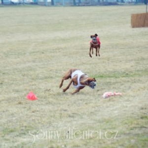 Po změně času, kterou jsem absolutně nevnímal jsme vyrazili na další bodovací závod do Kralup. Mareček měl zápas, tak zůstali s Matýskem doma a vzali jsme sebou bráchu Tomína. Cesta nám rychle ubíhala, až do doby, kdy nás v Byšicích zastavili páni policisté. Martinka neměla čisté svědomí, neb jela asi tak o pět km rychleji, tak hned myslela na nejhorší! Byla to pouze běžná silniční kontrola, kterou jsme zvládli a i pán policista byl na nás hodný! Taky jsem ho pořádně kontroloval, když se byl podívat do kufru. Do Kralup jsme přijeli včas. Zapsali jsme se a potom jsme vyrazili okouknout okolí. Trochu jsme si poběhal a šup odpočívat na první běh do auta. A už jsem se konečně dočkal. Martinka mě oblíkla do dresu, nasadila košík a já věděl, že přichází ten správný čas na lovení střapečku! Na start jsme se vyloženě doškrábal. Běžel jsem se svýma bráchama . Netrpělivě jsem čekal na to kouzelné slovíčko GO. A už jsem konečně mohl vyrazit. Pozice se na trati střídali. Krásně jsme s klukama spolupracovali a jak se patří a sluší pořádně jsme si tu „kořist“ naháněli. Já jsem si uprostřed trati dal i jedno cvičení z mého oblíbeného agility a do cíle jsem si doběhl první. Je to úžasný pocit zakillovat ten střapeček. V závěsu mi byl Hanísek a potom Gitánek. Radost byla veliká, co si budeme povídat. Martince to šrotovalo v hlavě jak to asi dopadne, ale po zkušenostech víme, že druhé kolo dokáže hodně zamíchat s pořadím! No po prvním kole se ze mě stal nejlepší RR a zároveň nejlepší pes závodu. Zajeli jsme si do centra na pořádnou baštu. Já jsem taky dostal kousek masinka. Pak už to šlo rychle a najednou jsme stáli v paddocku a čekali na vpuštění do dráhy. Běžel jsem s Hanýskem jako dva nejlepší psi. Závod byl velice vyrovnaný, první pozici si střídali, ale nakonec do cíle dorazil první a zakilloval Hanýs a já byl těsně druhý. Po nás nastoupilo duo Džamal Magdahor a Desmond Fontanesia. Běh nebyl tak rychlý a běželi si to své tempo a kolo. Do třetího běhu nastoupil Gitano Vuma Slunce života, Adargo Zulaykha a Anushka from Philaia. Fena nepředvedla nic moc výkon od startu uběhla asi tak 100m a pak čekala před cílem. A Gitáno vyhrál toto kolo.