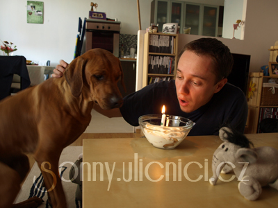 Když jsme přijeli domů, tak na mě čekala óbr dobrůtka, kdyby to jen viděl pan doktor:-D. Dostal jsem dortík z piškot a bobíka. A měl jsem tam i svoji první svíčku! Byla to mňaminka! A mám i dvě nové hračky! Páníčkové mi popřáli všechno nejlepší, hodně štěstí, zdraví a lásky. A taky mnoho proběhaných kilometrů.