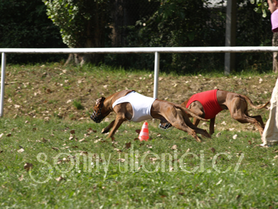 V neděli, kdy jsme byli zase plný energie a elánu, se opakovala situace ze sobotního rána. Po zabalení veškerých věcí se mimojiné sbalil i náhubek a moje dresy na běhání. Za hodinku jsme už byli na fotbalovém hřišti v Kralupech. Tam na nás čekali bráškové s Jardou a Kačkou, Jen co jsem uviděl ten bílý střapeček měl jsem jasno! Nebo spíš černo před očima a nevnímal jsem nic jiného než ten pohybující se střapeček! Díky Kačcce jsme byli už zapsaní, takže jsme šli na řadu sedmý. No byly to muka vydržet to, ale kdo si počká ten se dočká. Přijela nám fandit i teta Iveta s mojí maminečkou Naylinkou a bráškou Bouím. První běžel bráška Gitánek, tak jsem to mohl pořádně okoukat. Bohužel se mu střapeček zachytil na poslední kladce, takže jsme ho neviděli v cíli. Ale běžel moc krásně. Pak už jsem šel na řadu jáááá. Bylo to žůžo labůžo. Zase jsem mohl chytat ten střapeček. Doběhl jsem si krásně do cíle a pořádně a s radostí jsem zakiltoval! Dostal jsem moc velkou pochvalu! Pak jsme se koukali na ostatní, ale řeknu Vám bylo to hrozný koukat a nemoct běžet! Když se doběhali licenční běhy, začal se běhat trénink! Hanísek celý natěšený si konečně taky mohl zalovit a s ním se statečně pral bráška Bouí;-) Hanísek jako zkušený běžec zakončil lov překrásným saltem! Bouí také doběhl do cíle a střapeček si taky pokousal! Místo oběda jsme vyrazili prozkoumat okolí a udělat nějaké společné foto! Jako bychom jich neměli málo. Mezitím na sportoviště dorazili další bráškové. Richi s Mufíkem! No moc se neznáme, takže naše setrvání na jednom místě nebylo jedno z nejšťastnějších rozhodnutí! Už se zase blížila naše chvilka! Tentokrát jsme červený dres půjčili Gitánkovi a já běžel v bílém! Jen co jsme zjistili, že budeme závodit, neodtrhli jsme zrak ze závodiště a klepali jsme se jako kdyby bylo -15st. Aaaaa konečně zavolali naše jména, plný adrenalinu jsme nastoupili na start a už jenom čekali na to kouzelné slovíčko GOUUUU. Běželi jsme co nám nohy stačili a každý jsme si ten střapeček chtěl ulovit. Běželi jsme moc krásně a oba jsme si mohli zakiltovat. Opět velká pochvala a páníčkové jsou na mě pyšní, že je mi úplně fuk jestli mám košík a dres, hlavně, že můžu lovit! Po vyběhání mě Mareček zase nahnal do auta, ale tentokrát už jsme si to frčeli domů! Doma jsem vyloženě padl za vlast a stejně jako v sobotu jsem se probudil až druhý den! Děkujeme Vám všem za krásně strávenou neděli!