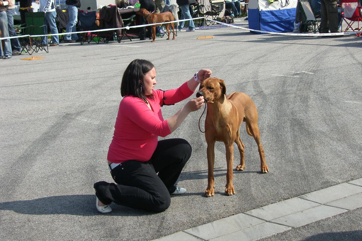 Dnes jsme opět vstávali hrozně brzo. Rušno u nás bylo už v 4.30. Musela se nakrmit ta naše mrňavá dravá zvěř. Já jsem se moc neznepokojoval a chrupal jsem si s páníčkem dál. V 5.30 nás Martinka vykopala z pelechu oba dva a museli jsme se jít také připravit. Plánovaný odjezd byl na 6 hodinu. Ale to jsme jaksi nezvládli a odjížděli jsme skoro s 3/4 hodinovým spožděním! V kufru jsem tentokrát měl malinko místa, bylo tam se mnou prtěfáro. Ale cestu jsem přežil. Mareček s námi uháněl jako o závod, abychom dohonili tu počáteční ztrátu. Celá naše posádka byla vyletněna a jaké bylo překvapení, když jsme přijeli do Budějovic a tam byla zima a mlha. Nejdříve jsme se zamotali v centru, ale pak jsme náš cíl našli. Mezitím nám teta Kačka vyzvedla katalog a my jsme v klidu zaparkovali. Tentokrát to šlo velice rychle, ale v kruhu nás bylo 14, takže se to rozdělilo na tři skupiny. Ano my byli zase v poslední. Jako vždy! Malinko zmatky byli, protože když se blížila naše minuta vystavování, tak si Matějíček usmyslel, že má hlad. Tak jsme ho rychle napojili a už jsme upalovali do kruhu. Bráchové už tam na nás čekali. A mohli jsme se do toho z vesela pustit, ano hlavně z vesela! Chyběl mi tam Mareček, takže jsem pořád po něm pokukoval a ani ty dobrůtky mě tentokrát vůbec nezajímali. Martinka byla moc spokojená s průběhem výstavy. Fotky máme jenom od brášky, protože to byl náš první výjezd po Matýskově narození, tak Mareček musel poctivě drndat škvrně v kočárku!