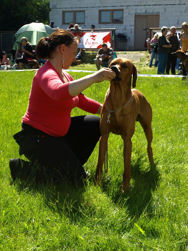 Náš plánovaný odjezd byl na šestou hodinu ranní. Vše by to bylo super, kdyby Martinka nezaspala a tím pádem jsme vstávali deset minut před šestou! Vše se dělo maximální rychlostí a v půl sedmé už jsme seděli ve voze a jeli jsme směrem Klatovy! Po dvou hodinách náročné cesty jsem konečně dorazili na místo! Zaparkovali jsme, sebrali naše velká zavazadla a už jsme si to mašírovali na přejímku! Tam nás čekalo nemilé překvapení:-) ale nakonec vše dobře dopadlo a my jsme se mohli uvelebovat u kruhu. Tímto děkujeme holky za pomoc! Vy víte! Před námi bylo ještě pár pejsků, tak jsme měli čas na blbnutí a vyvenčení. Náš nástup na scénu jsme odhadovali až tak na poledne, ale jaké bylo naše překvapení, když nás volali do kruhu asi tak v půl jedenácté. Nastoupili jsme do kruhu ve složení čtyř zrzounků z toho tři jsme byli Sluníčka života! Připravili jsme se na akci a šlo se na věc. Dali jsme si pár koleček, pak nezbytné posouzení rozhodčím. Zaujali jsme výstavní postoj a čekali na umístění. Brášku Draka vystavovala Radka, neb Luboš to celé Propásl. Tímto jim moc gratulujeme a doufáme, že jsme tetě Ivetě udělali radost! A děkujeme za krásnou slunnečnou sobotu!