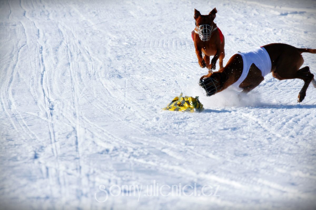 Poslední lednový víkend nás čekal první coursing v tomto roce! Na cesty jsme se sbalili už v sobotu po obědě! Namířili jsme si to směr Děčín k Haničce, která pro nás měla přichystané zázemí na tyto dva dny! Jen co jsme se rozkoukali vydali jsme se na procházku Děčínem! Město nás překvapilo, čekali jsme to horší! Cestou jsme potkali nádherné labutě, které mi nedali spát! Bohužel jsem byl na vodítku jinak bych se za nimi jisto jistě rozběhl! Pokračovali jsme dále kolem krásného zámečku po nábřeží a šupky dupky do teplíčka! Spinkat jsme šli celkem brzy neb se ráno vstávalo už kolem půl sedmé! Martinka mi ráno nemusela ani slovem naznačit co se budu dít! Podle ní mám asi v sobě radar a moc dobře jsem věděl proč je ráno takový rozruch! Pořádně jsem ji vykňučel a šli jsme na čůrando! Mezitím se to doma zbalilo a mohli jsme vyrážet směr Jílove – Sněžník! Jen co jsme překročili hranice Děčína, už jsme jeli po zasněžené cestě obklopení nádherně zamzrlou lesní krajinou! Paní navigace nás vedla dobrým směrem a po dvaceti minutách jízdy jsme konečně zastavili na tom pravém místě! Parkoviště bylo přímo před dráhou, tak jsme to měli z první řady! Na místě na nás už čekala maminka Naylinka a bráškové Gi s Hanim. Na přejímce bylo docela dusno, ale čo bolo, to bolo! Nějak mě to celé rozhodilo, ale já jsem se nevzdával, neb brod byl ještě daleko! Z toho celého rozruchu jsme tam zapoměli na stole ňamky. Než se všichni přihlásili, tak jsme se schovali do příjemné hospůdky na čaj. V devět se začalo závodit. Start byl posunut protože to tam docela foukalo. To byly nervy čekat než přijdu na řadu! V prvním běhu jsem dostal bráchu Haňase. Trať byla docela náročná a aby toho nebylo málo, tak jsem si ji ještě zhoršil během ve vysokém sněhu! Doběhl jsem druhý, ani jsem si nezakiloval, tak snad příště! Šli jsme se s Marečkem vyběhat, Martinka mezitím připravila občerstvení a pelíšek! Matěj to celé prospal:-) sedli jsme si do hospůdky a já za odměnu dostal pár piškotků a taky kousek knedlíčků z polévky! Zbytek času jsem sbíral síly na další kolo v mém pelíšku! Běhalo se rychle a ani jsem se nenadál a už jsem zase stál v sedlišti připraven a plný očekávání na ten žlutý střapeček! Toto kolo jsem běžel s Gitánem! Trať mi teď přišla jednoduší, ale ke konci jsem si myslel , že střapečkovi nadběhnu, ale on už si to mířil do cíle, ale stihl jsem ho a už jsem ho měl a pak zase odjel! Potvora jedna! Čekání na konec závodu a vyhlášení výsledků jsme si s Marečkem spestřil prozkoumáváním okolní přírody a taky jsem ho pořádně potrénoval! To aby si nemyslel, že tady bude jen tak stát! Vyhlášení výsledků a ostatně i druhé kolo probíhalo za azurového a slunečného počasí! Tak jak se patří pro Sluníčka života! Absolutním vátězem se stala naše maminka Naylinka – tímto jí moc gratulujeme a jsme na ní pyšní, že i v šesti letech běhá jako mladice! Já jsem skončil na krásném 3. místně! Na druhém byl GI a první se opět stal Hani! Všem moc gratulujeme a těšíme se na další běhání! Opět jsme si užili nádherný víkend! Spostu fotek najdete v Galerii.
