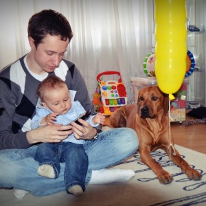 Dnes jsme se probudili do velice slavnostního dne! Náš mrňous Matějíček je rok na světě! Uběhlo to rychlostí blesku a z uzlíčka, který jenom leží, spí, jí a sem tam občas zabrečí se stal loupežník, který všechno rabuje a všude vše prozkoumává! Ale je už s ním větší sranda! Ležíme spolu na zemi, tulíme se spolu a honíme se po bytě! Ráno jsme posnídali, počkali na taťku a potom jsme se vydali na velkou procházku na Radouč! Každý si ji užil! Já jsem si poběhal s Marečkem, zalovil pár pohybujících se zajíčků a Matýsek se pohoupal na houpačkách! Moc se mu také zalíbila skluzavka! Když jsme se vrátili domů, tak Matýska vzali na večeři a já jsem si konečně po tom náročném dni mohl v klídku schrupnout v pelíšku!